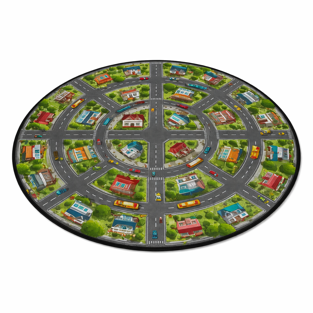 Offrez à votre enfant un espace de jeu ludique et stimulant avec ce tapis de jeu rond représentant une ville complète avec routes, maisons et intersections. Idéal pour jouer avec des petites voitures, ce tapis favorise l’imagination, la créativité et le développement de la coordination.