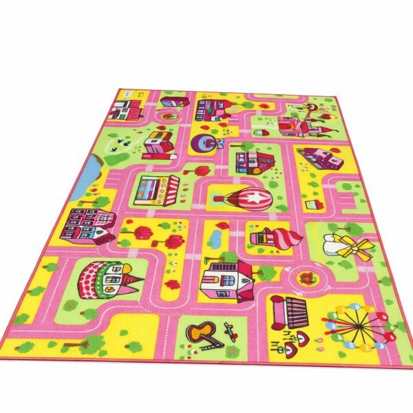 Ces tapis représentent une ville colorée vue du dessus avec des routes, maisons, bâtiments, parcs et attractions (château, montgolfière, manège, moulin, etc.) et un réseau routier très détaillé traversant une ville, des quartiers résidentiels, des fermes et des zones vertes. Ils créent un véritable univers miniature où l’enfant peut inventer des histoires et faire circuler ses jouets.