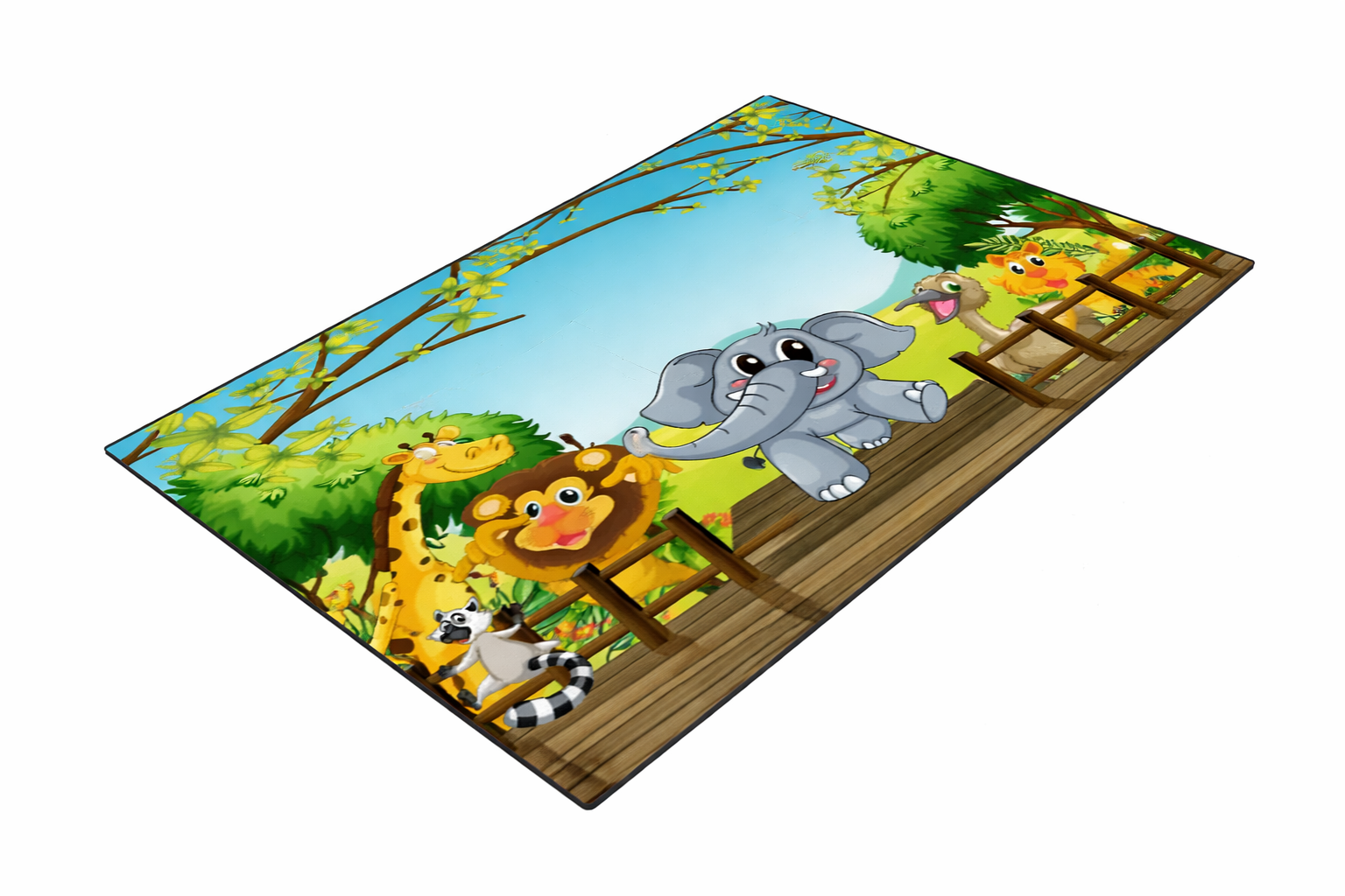 Ce tapis met en scène des animaux adorables tels qu’un éléphant, un lion, une girafe, un lémurien et des oiseaux, évoluant dans un décor verdoyant et joyeux.
